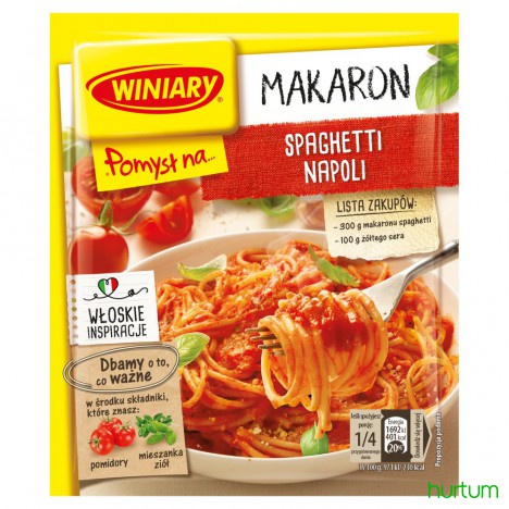 Winiary Pomysł Na… Spaghetti Napoli to propozycja na smaczny obiad inspirowany kuchnią włoską. Dzięki aromatycznej mieszance suszonych warzyw i ziół danie jest doskonale przyprawione i wspaniale komponuje się z makaronem spaghetti.
