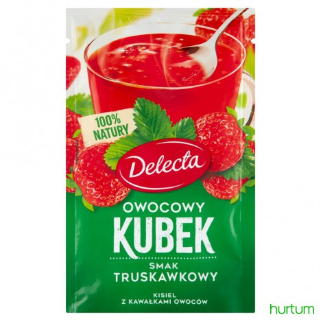 Kisiel o smaku truskawkowym w proszku z kawałkami owoców.