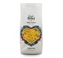 Tradycja wyrabiania własnego makaronu jest obecna w naszych domach od dzieciństwa. Babcia wyrabiała ciasto na makaron łącząc mąkę, jaja i wodę. Ciasto później wałkowała w duże płaty które suszyła na czystych prześcieradłach na łóżku. Gdy płaty nieco już się podsuszyły, babcia kroiła je w pasy nożem i wkładała do maszynki na makaron, a wnuki pomagały kręcić korbką. Tak właśnie powstawał w domu naszej babci makaron do rosołu. To wspomnienie zainspirowało nas do stworzenia makaronu, który pozwoliłby poczuć smak tej tradycji na Państwa stołach. Tak narodził się Śląski Bifej.